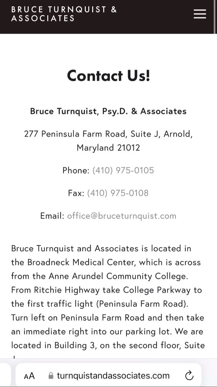 Bruce Turnquist, Psy.D. & Associates is a group of mental health professionals working together in Arnold, MD. We are committed to honoring God and serving our community by providing caring evaluation and treatment of a wide range of emotional, behavioral, and relational problems. The populations we serve are diverse, ranging from young children and adolescents to adults and seniors.